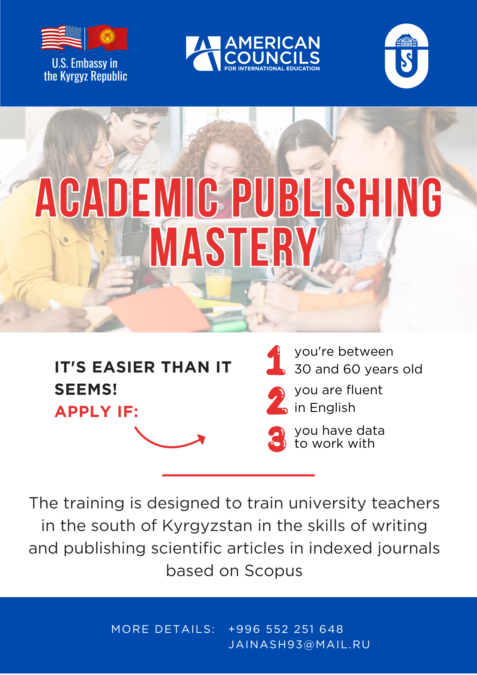 С сегодняшнего дня мы начинаем отбор участников на тренинг Academic Publishing Mastery, который пройдет с 18 по 22 ноября 2024 года на базе Международного медицинского факультета Osh State University. Это уникальная возможность для всех преподавателей улучшить навыки академического письма и публикаций.